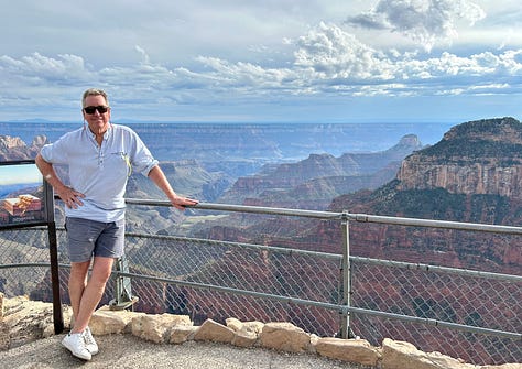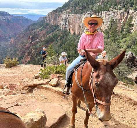 My wife hails from a cowboy family so we try to keep that spirit alive. For the last week of September we went back to the North Rim, which IMHO is the best national park experience you could have. It’s truly one of the most remote places to get to in America, and that’s part of the beauty. A vast expannse, with very very few people. The rustic and huge North Rim Lodge sits right on the lip of the Rim, and it’s in the same family as El Tovar and the biggies on the South Rim: stone, timbers, fireplaces, soaring ceilings, 100 years old. There’s 3 sizes of log cabins (reservations must be made well ahead of time but aren’t hard to get.) and the hiking, star-gazing and scenery are, of course, jaw-dropping. We rode mules out along the Rim, then 4 miles down the steep and zig-zagging North Kaibab trail, and despite wind, rain and hail, the trip is hard to beat. North Rim (about 8,500 ft elevation and heavily forested) is only open/accessible from May 1 til Oct 15. Cannot recommend enough.